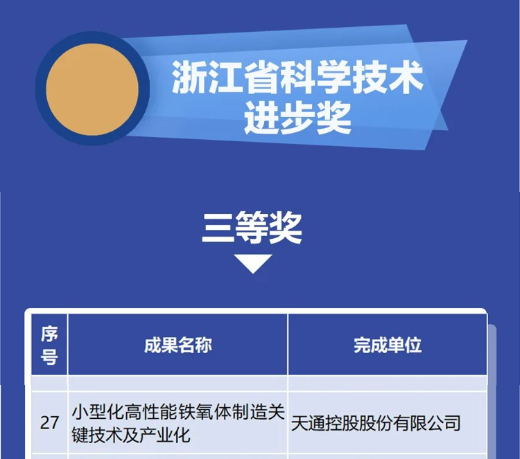 在7月11日下午召開的全省科技創(chuàng)新大會(huì)上,2021年度“浙江省科學(xué)技術(shù)進(jìn)步獎(jiǎng)”等一系列獎(jiǎng)項(xiàng)揭曉,天通控股股份有限公司“小型化高性能鐵氧體制造關(guān)鍵技術(shù)及產(chǎn)業(yè)化”項(xiàng)目榮獲浙江省科學(xué)技術(shù)進(jìn)步獎(jiǎng)三等獎(jiǎng)。這是天通公司磁性材料第八次獲得浙江省科學(xué)技術(shù)進(jìn)步獎(jiǎng)。