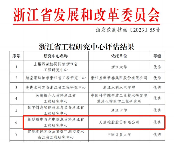 近日,省發(fā)展改革委公布了浙江省工程研究中心建設(shè)及運(yùn)行情況評估結(jié)果,天通控股股份有限公司“新型磁電與光電信息材料浙江省工程研究中心”評估結(jié)果喜獲優(yōu)秀。此次參與評估的省工程研究中心共計29家,其中8家被評為優(yōu)秀,“新型磁電與光電信息材料浙江省工程研究中心”是嘉興唯一一個獲評優(yōu)秀的工程中心。